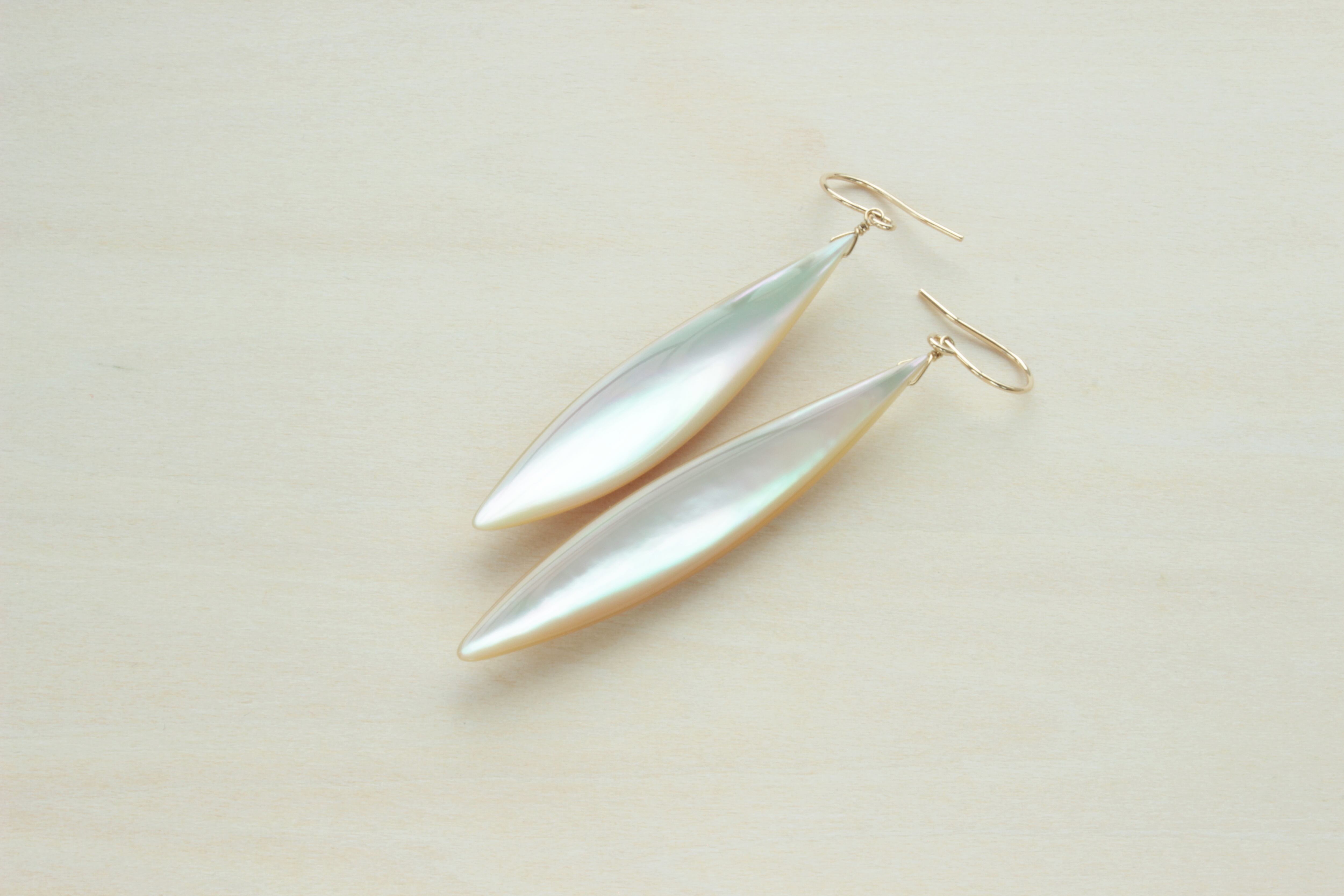 夜光貝の美しい筋とそれを囲む輪郭線をそのまま切り取って小魚をモチーフにしたピアスになります。