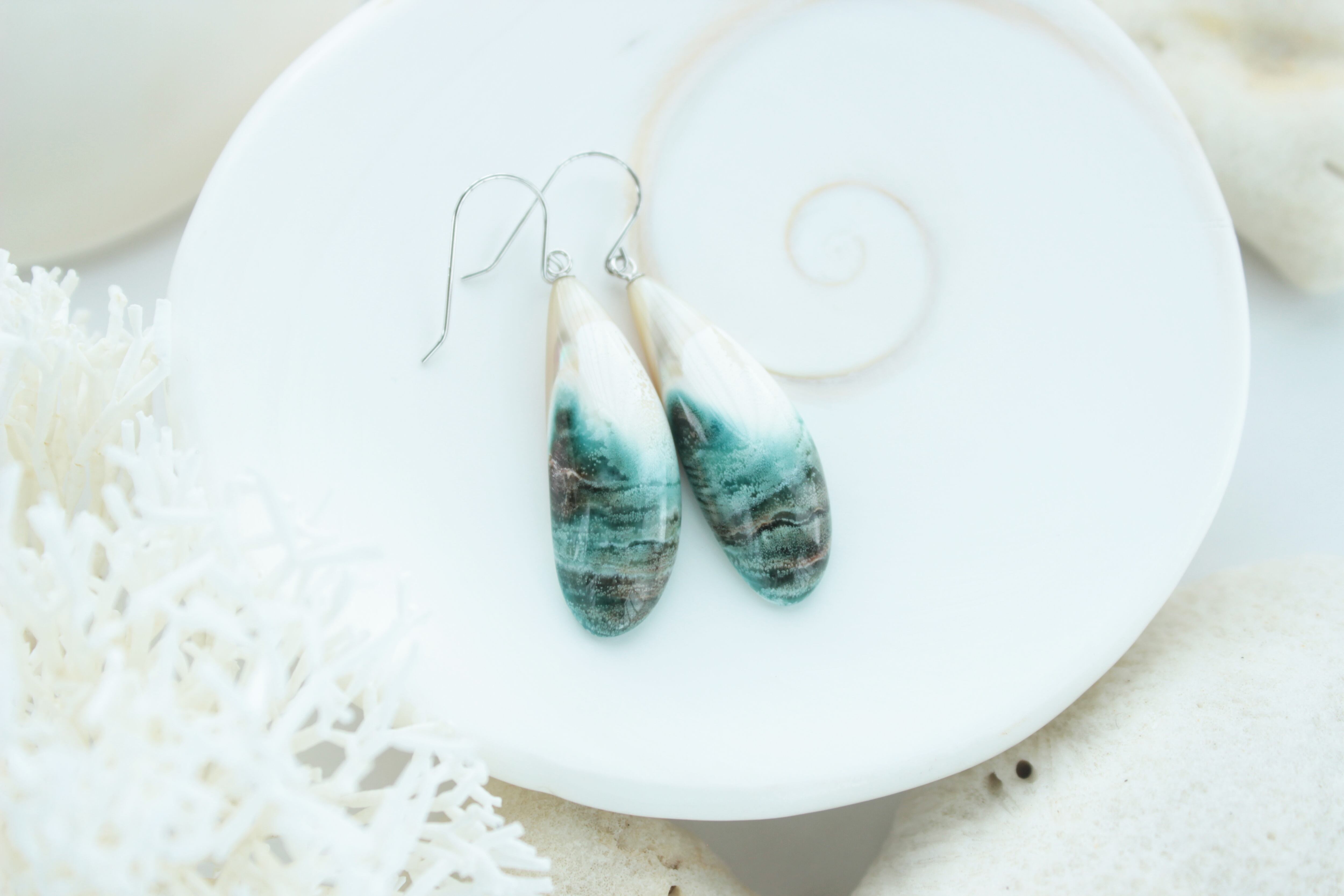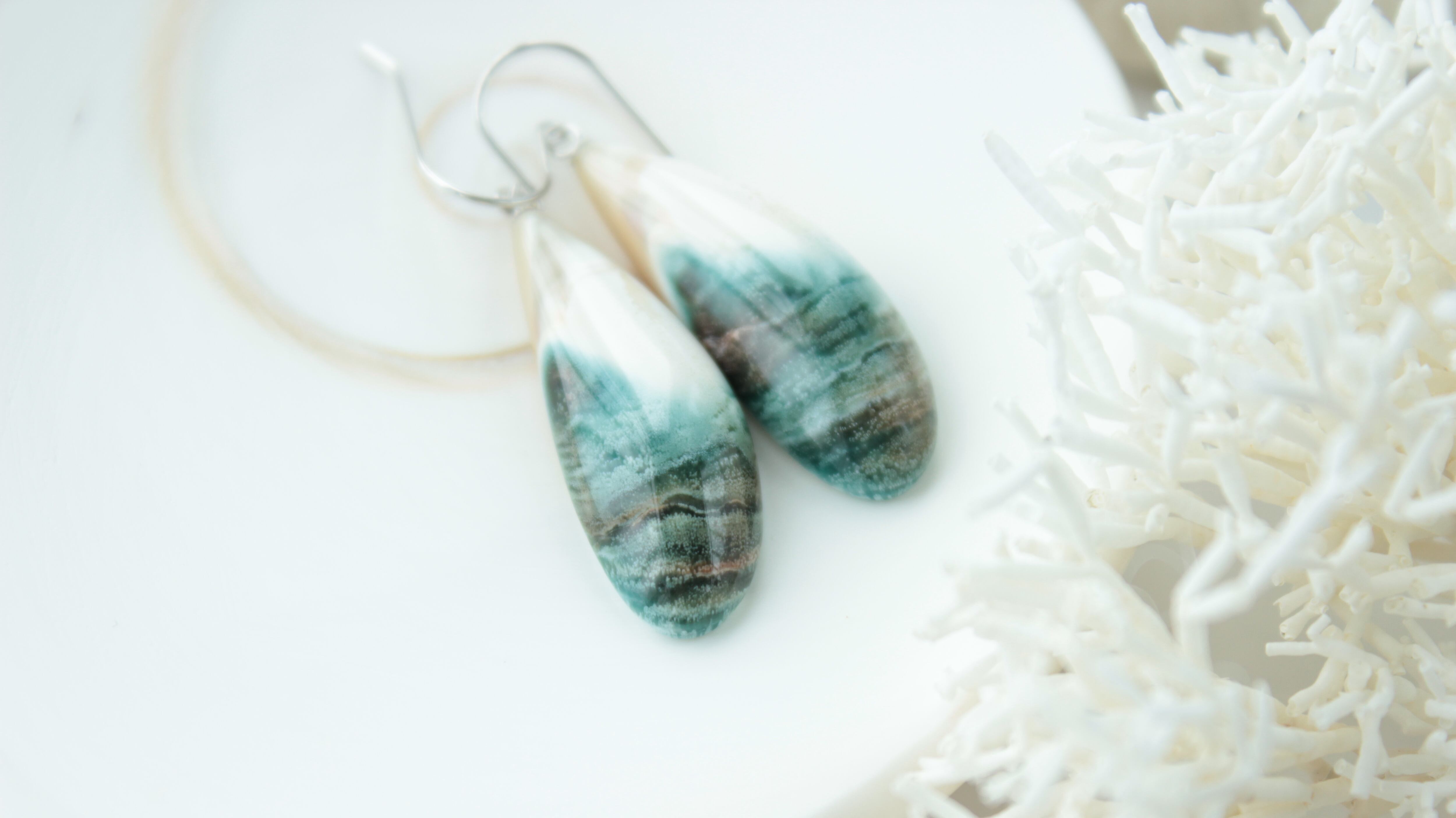 夜光貝の緑の層をカタチに沿うように切り出し海の雫のようなピアスを製作致しました。